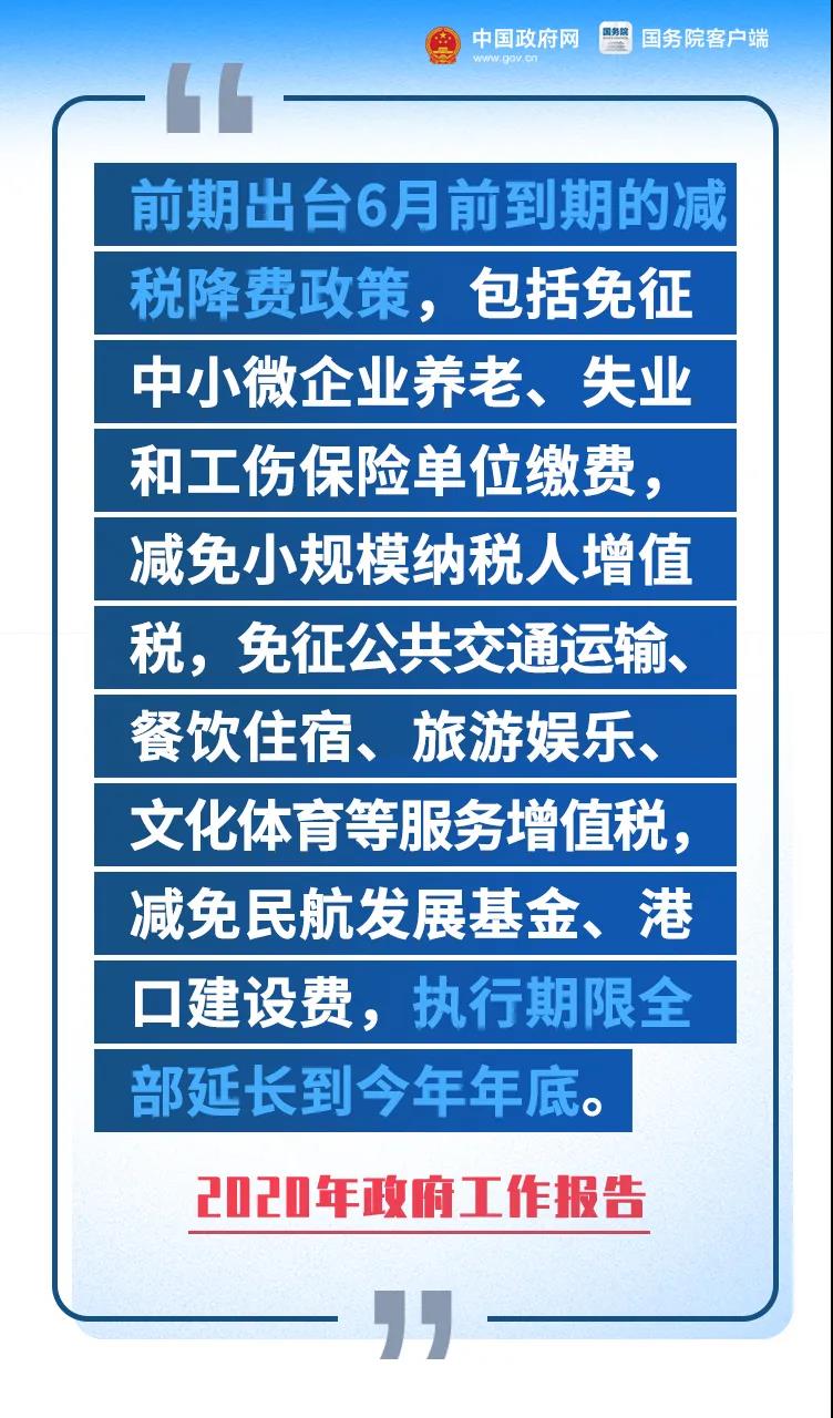 让我们来回忆一下,5月22日(星期五)上午9时,国务院总理在做政府工作报告时提出,前期出台六月前到期的减税降费政策,包括免征中小微企业养老、失业和工伤保险单位缴费,减免小规模纳税人增值税,免征公共交通运输、餐饮住宿、旅游娱乐、文化体育等服务增值税,减免民航发展基金、港口建设费,执行期限全部延长到今年年底。